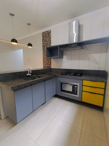 Imóvel com 03 (três) dormitórios, 01 (um) banheiro, sala, cozinha, vaga de garagem para 02 (dois) carros e área gourmet com churrasqueira.